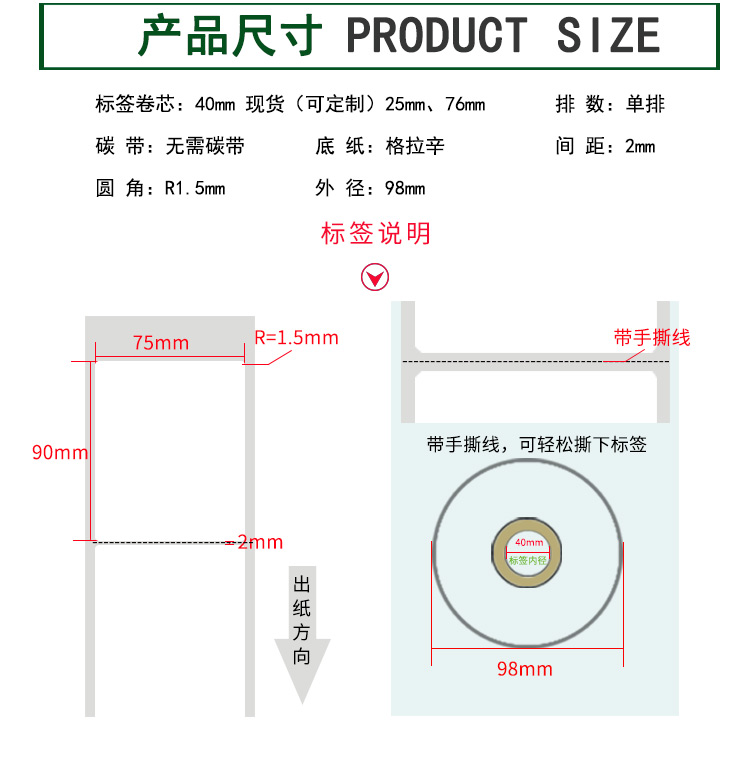 【標簽間距】2mm、圓角R=1MM、卷芯寬度:40mm