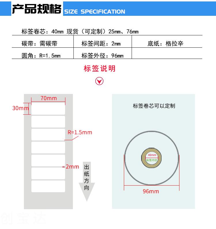 適合不同氣候地區使用,適用電子電器、五金塑膠、服裝、醫藥、日化、食品、商超、倉儲物流、資產管理、條碼標識、外箱貼紙等長期保存的產品標簽及外箱標簽同時也可以用于長時間保存(配合碳帶)的亞馬遜、郵政國際、物流標簽、郵政包裹、EBAY、速賣通、遞四方、出口EUB標簽、出口電商等標簽