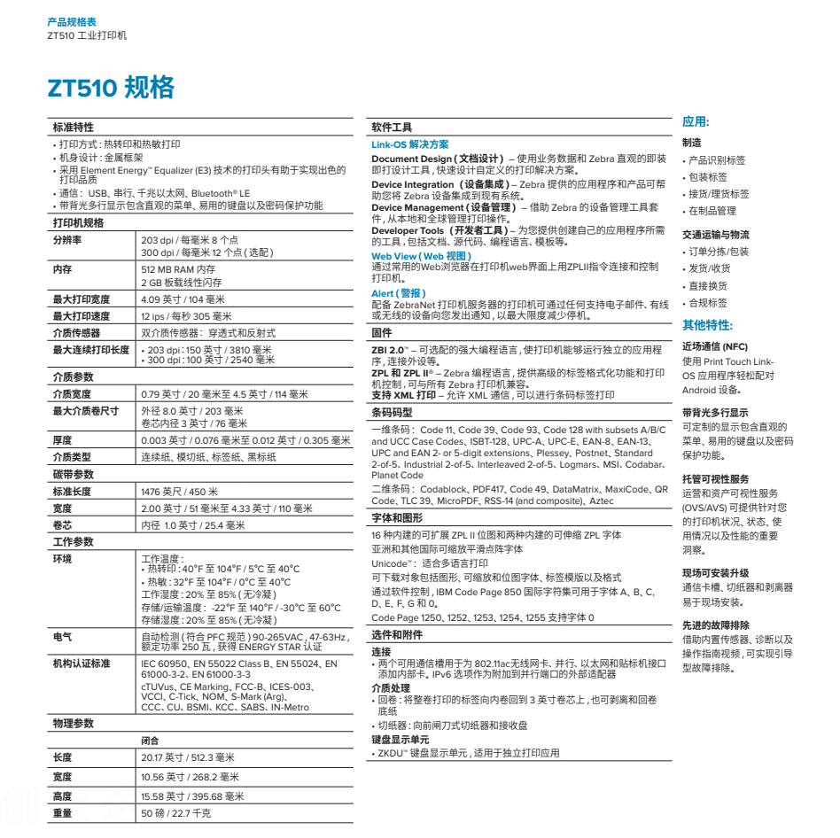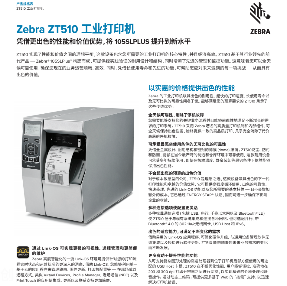ZT510 以行業(yè)領(lǐng)先的 105SLPlus 打印機(jī)功能為基礎(chǔ),可以經(jīng)濟(jì)高效的價(jià)格點(diǎn)提供您所需要的工業(yè)打印機(jī)核心功能。ZT510 采用久經(jīng)驗(yàn)證、堅(jiān)固耐用的設(shè)計(jì)和結(jié)構(gòu),同時(shí)增加了先進(jìn)的管理和監(jiān)控功能。這意味著可幫助您不僅可在當(dāng)下實(shí)現(xiàn)每周 7 天、每天 24 小時(shí)的穩(wěn)定順暢運(yùn)行,還具有出色的使用壽命和先進(jìn)功能以從容應(yīng)對今后數(shù)年內(nèi)的每一個(gè)挑戰(zhàn)——并且價(jià)格經(jīng)濟(jì)實(shí)惠。